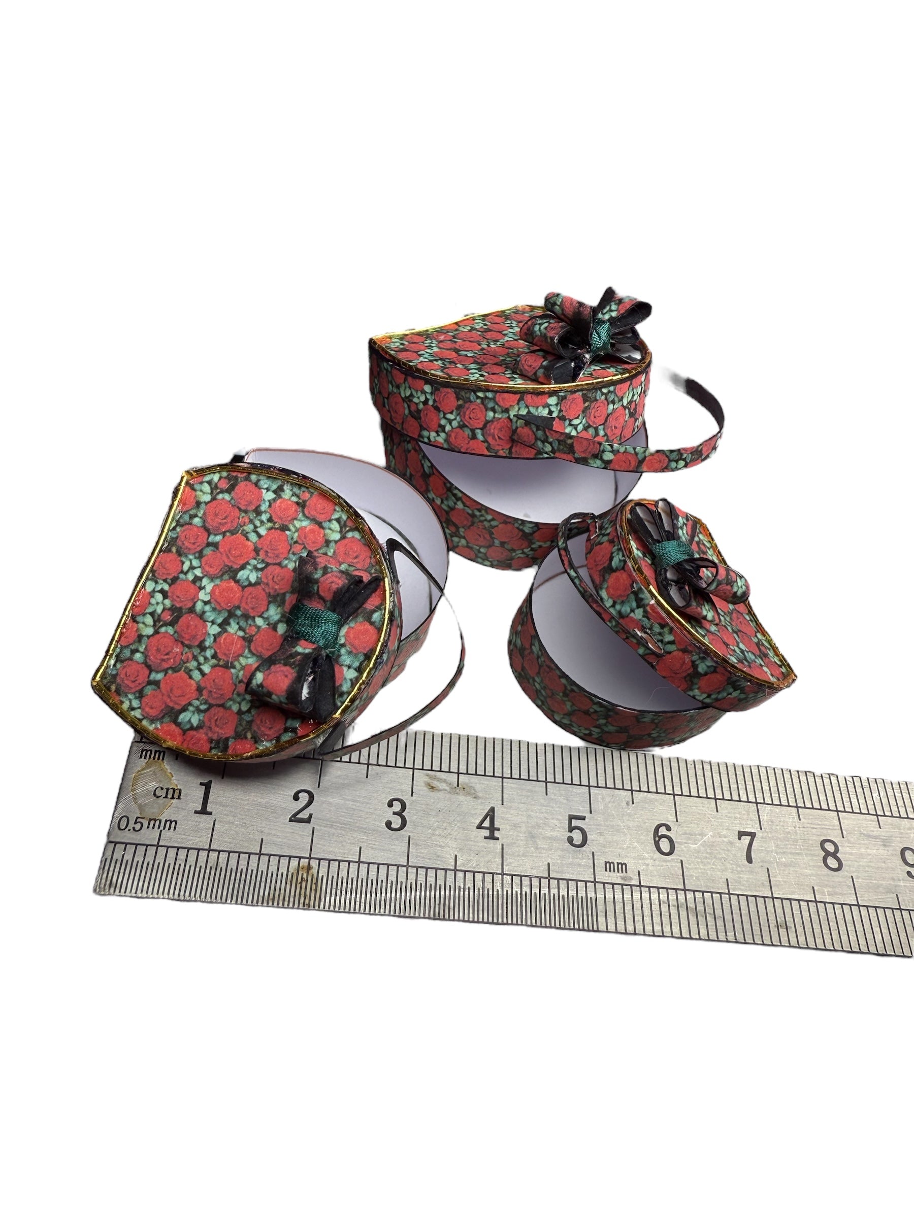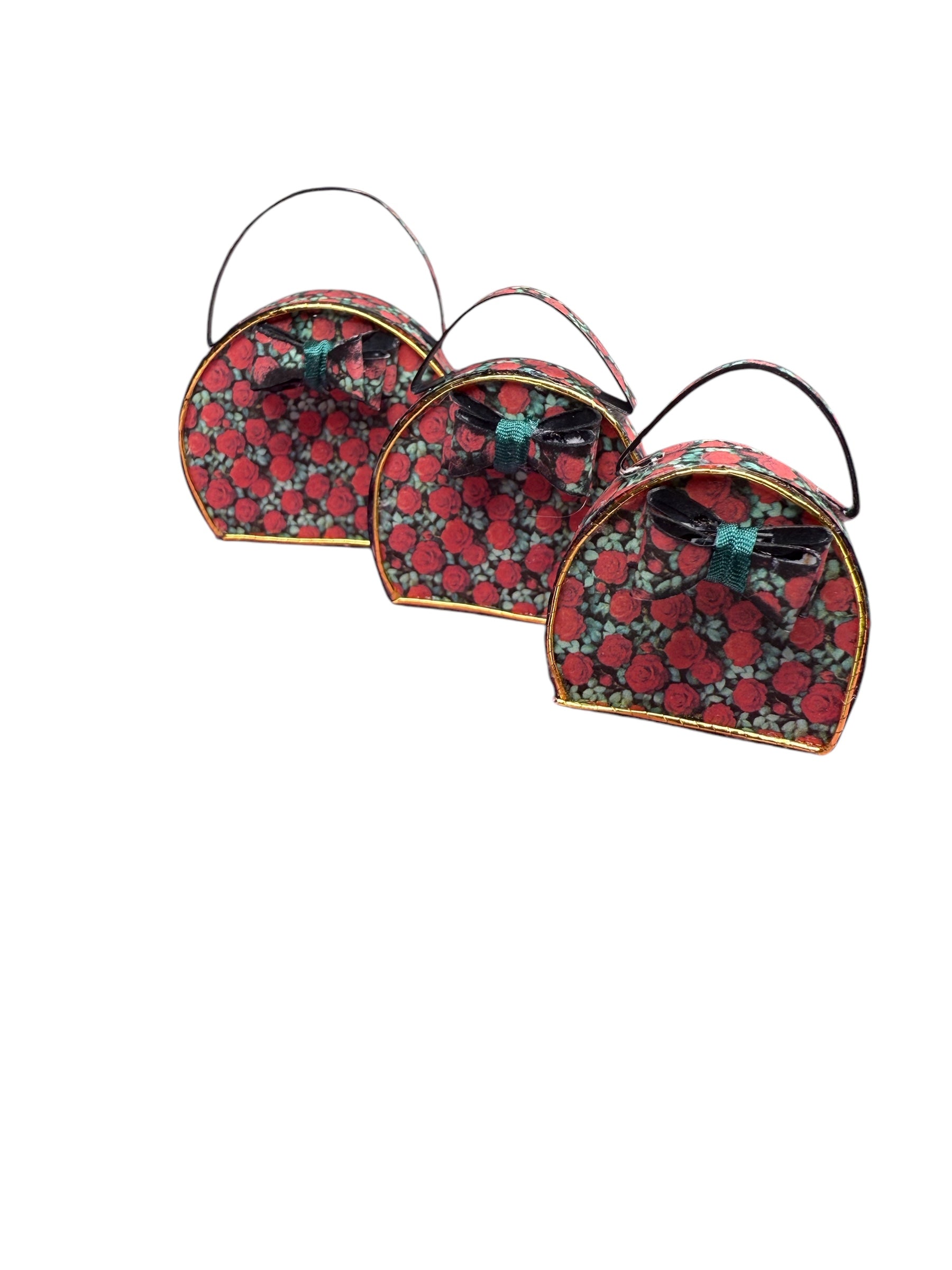 1/12th scale vanity cases. Red roses design from little Deliveries papers, with double bow and 2mm silk ribbon trim