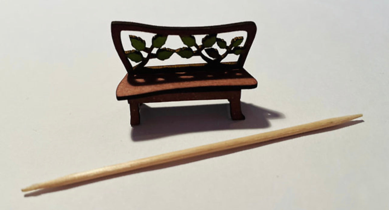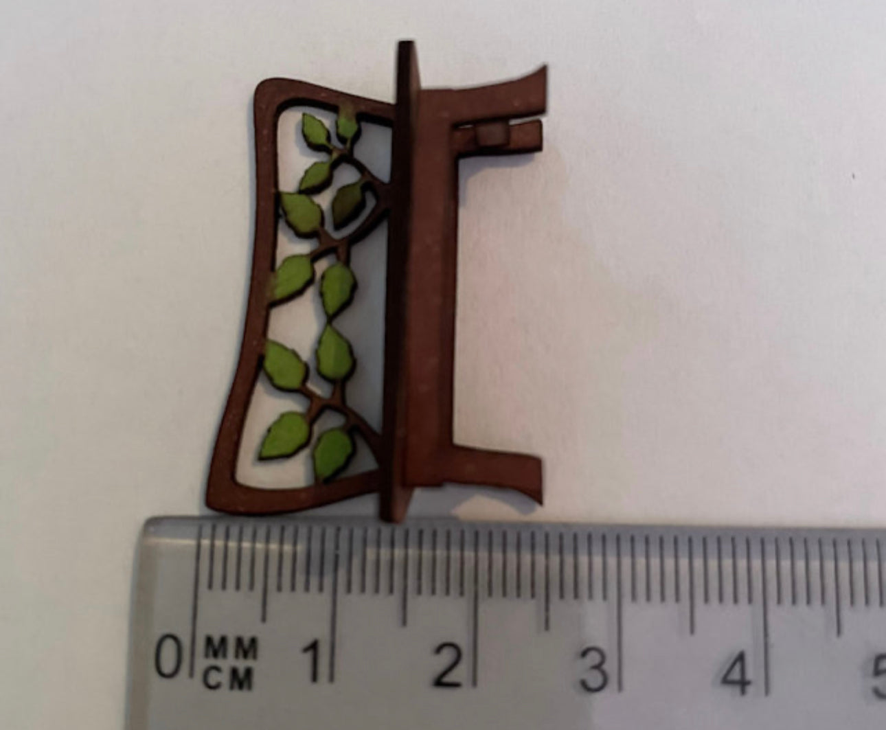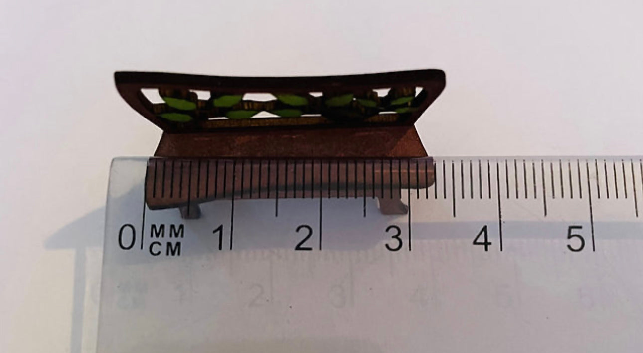This 1/48th kit Enchanted forest bench is flat-packed and comes in kit form for easy construction. Choose any colour to paint it. It measures 1.2 cm wide, 2.5 cm high, 1.2 cm deep, and 3.8 cm long.