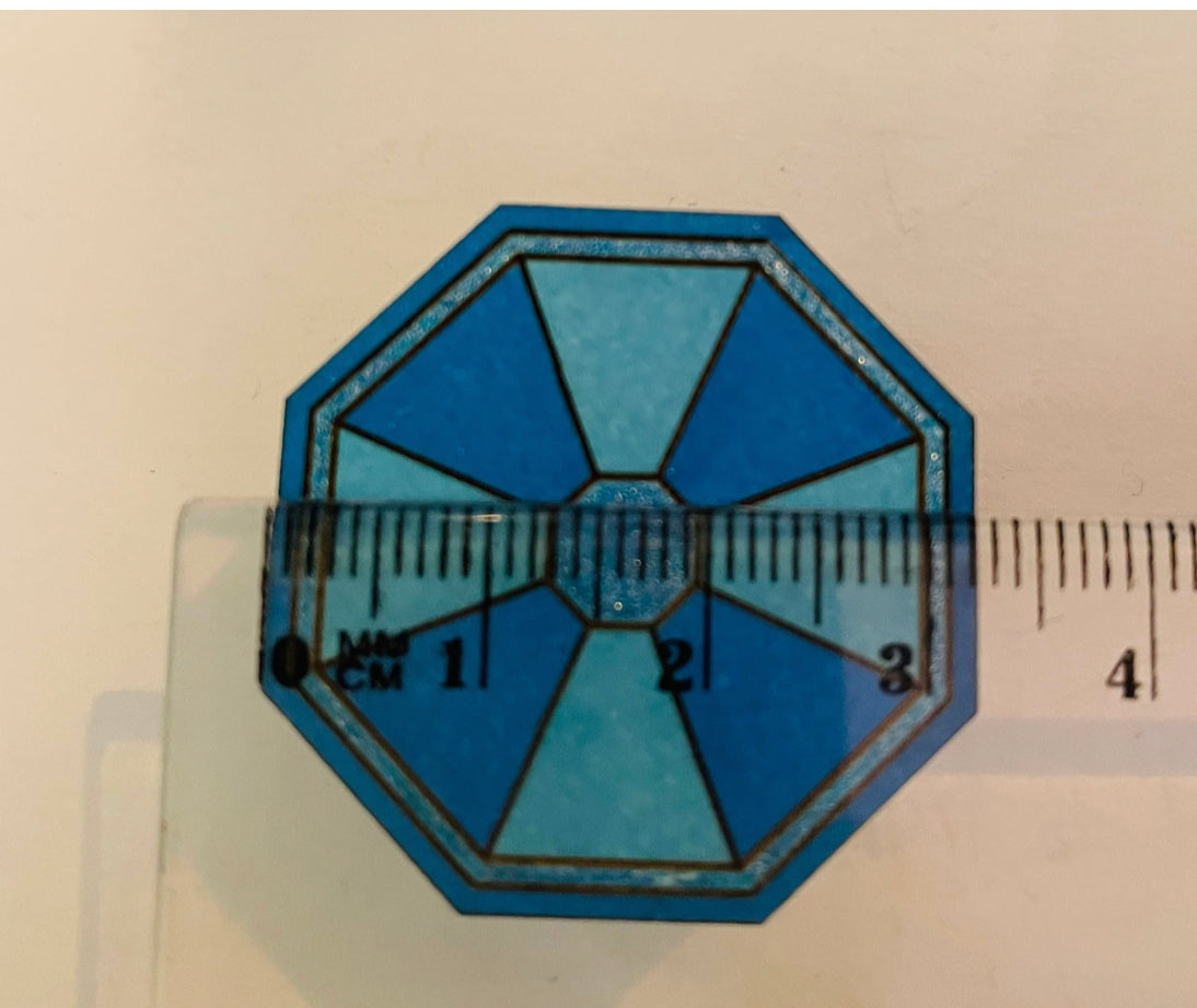 The table measures 3.2 cm in circumference, while the chairs measure 1.8 cm wide and 2 cm high.