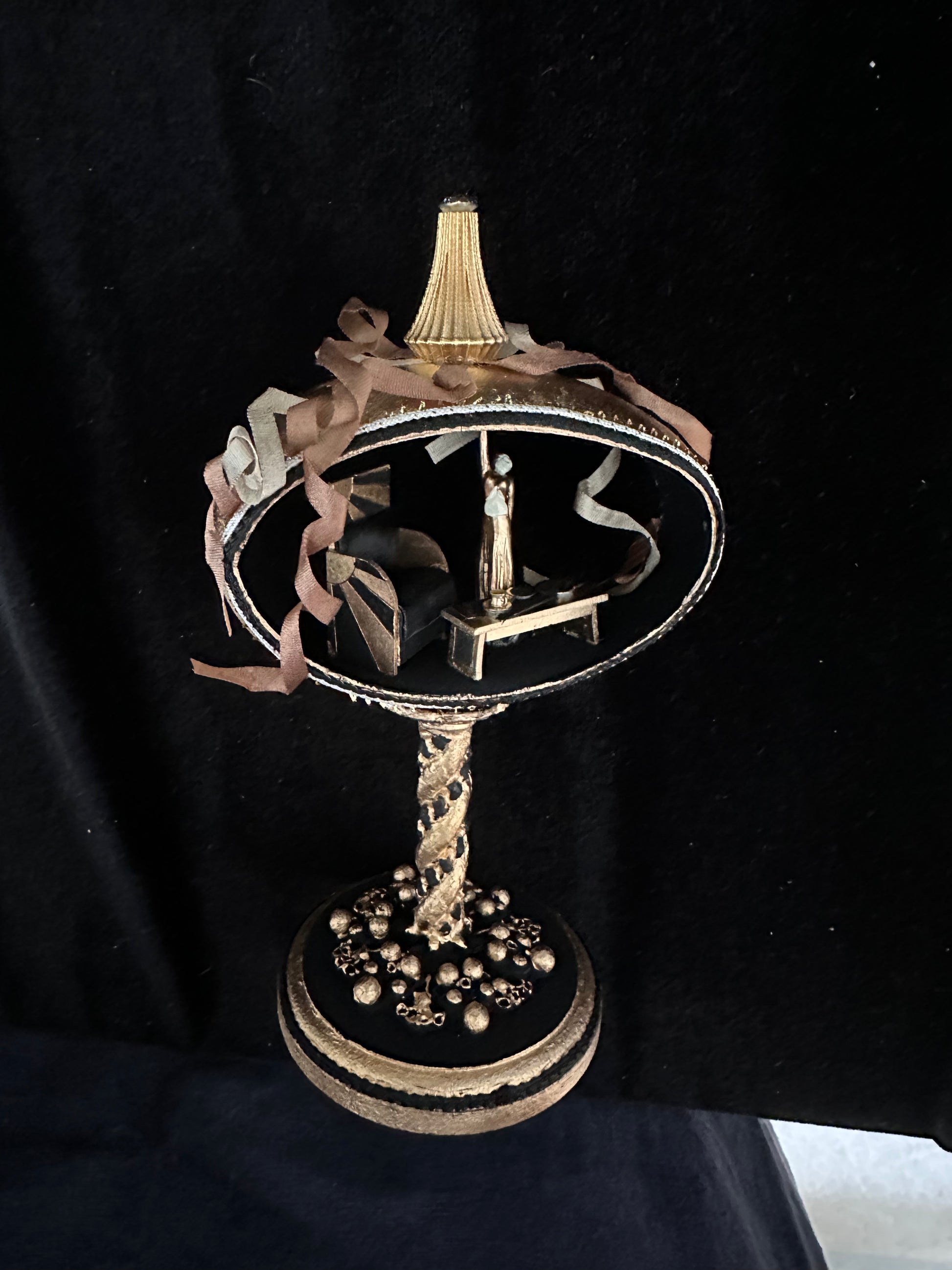 A beautiful copper coloured egg with a lovely art Deco scene inside, a chair & a coffee table and an elegant die -cast dancing figurine. the Egg is topped with coffee & cream coloured ribbons and a gold finial.