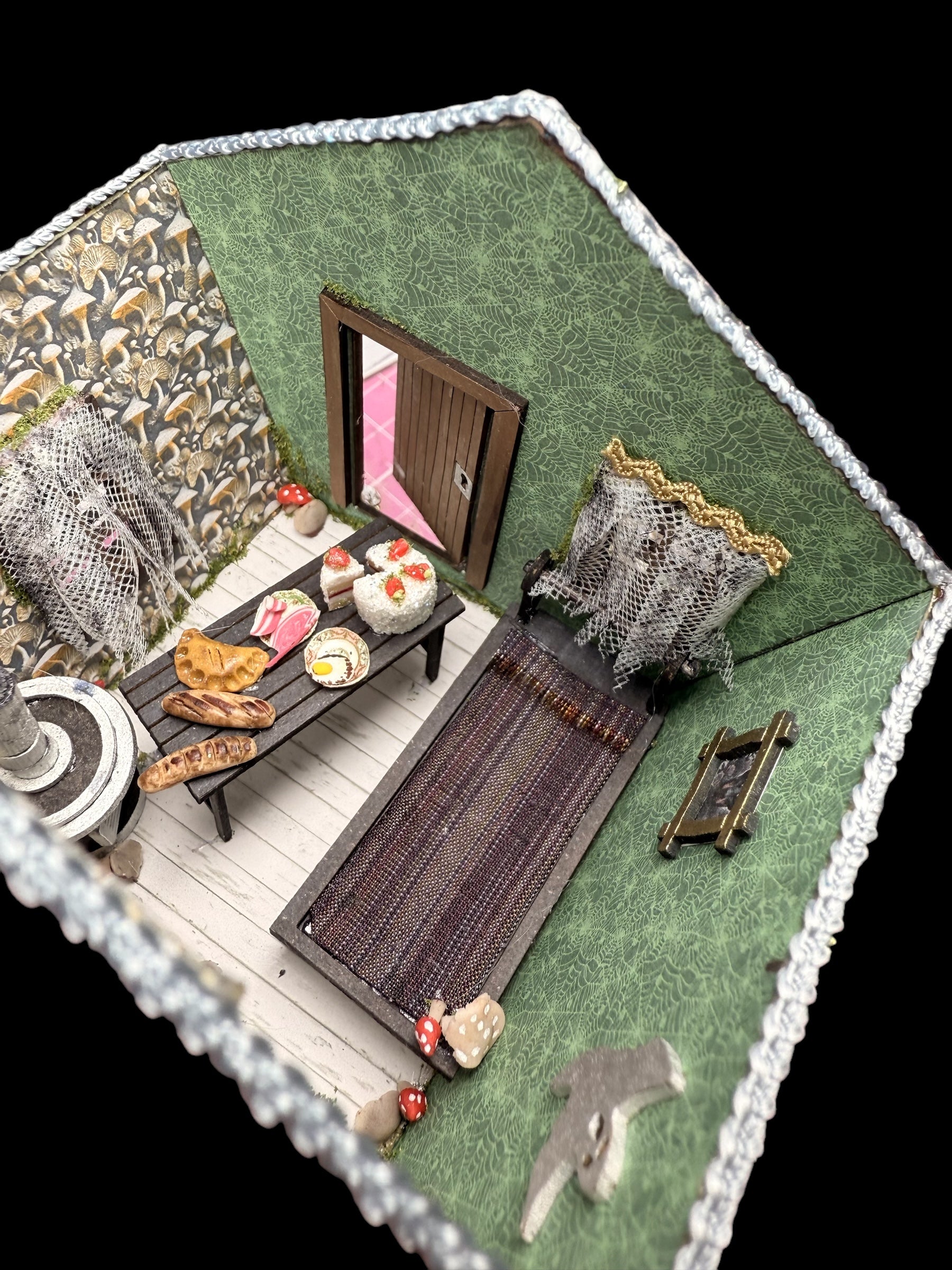 Size: 12.5 cms high x 9.3 cms wide x6.5 cms deep (room) x 7 cms deep (roof) at the widest point.