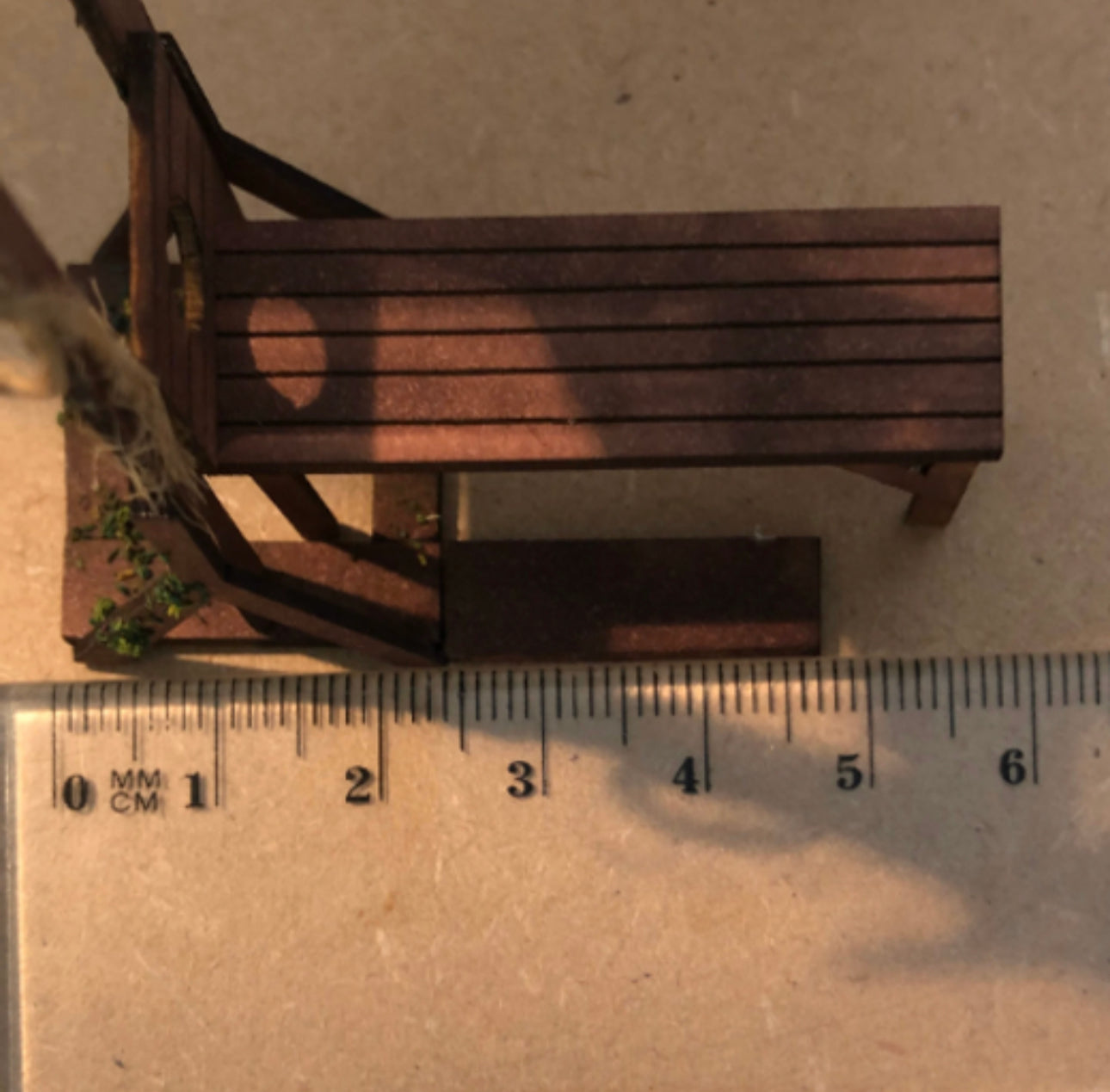 Size: 5.5 cms length x 2.5 cms depth x 6cms high. You can shorten the legs to make it smaller if you wish.