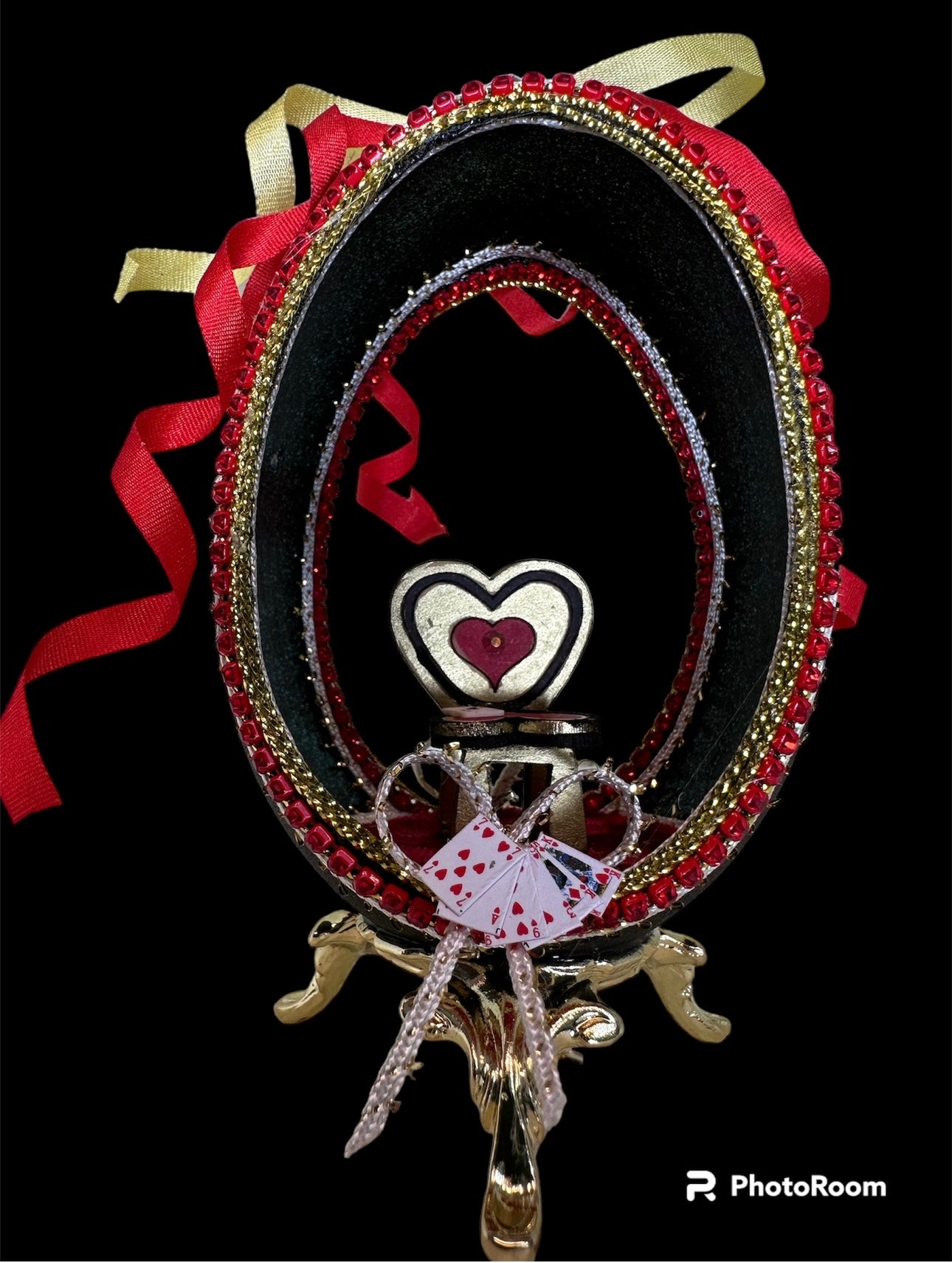 This simple yet striking goose egg has an oval aperture cut into to the back & the front showcasing a lovely chair from Raptoor Craftings 'wonky Wonderland collection' the egg is trimmed with red crystal chain and curled silk ribbons. the chair is designed by Angela Kinnunen and available for sale in KIT form from this shop (Little deliveries)