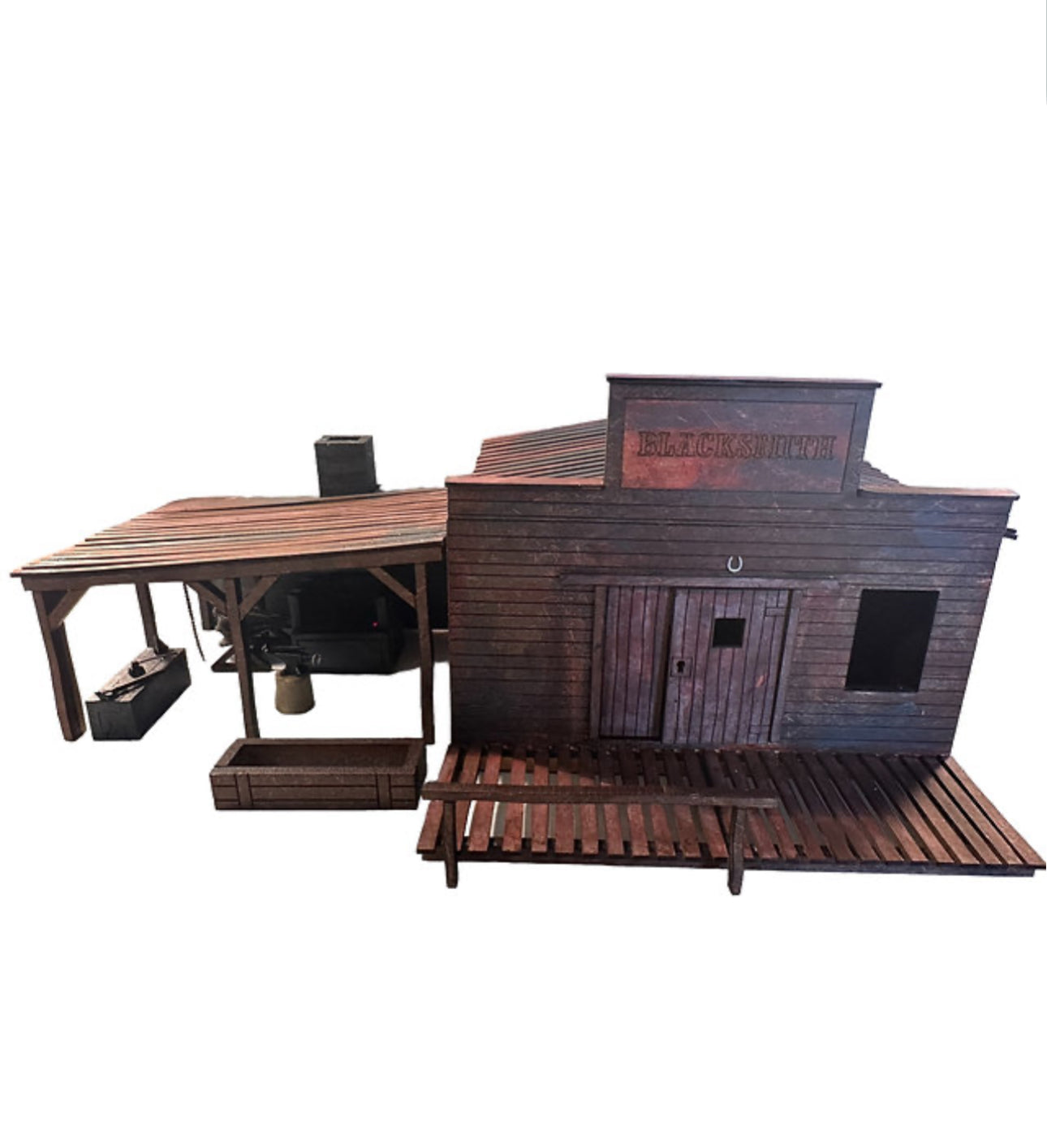 Flat packed, in kit form and ready for construction in colours of your own choosing. This is an advanced kit for an experienced dolls housemaker. The kit includes the 3D printed items from laser shrink ray. Bellows and stand, coals for the forge, tools, horseshoes and anvil with wooden stand.