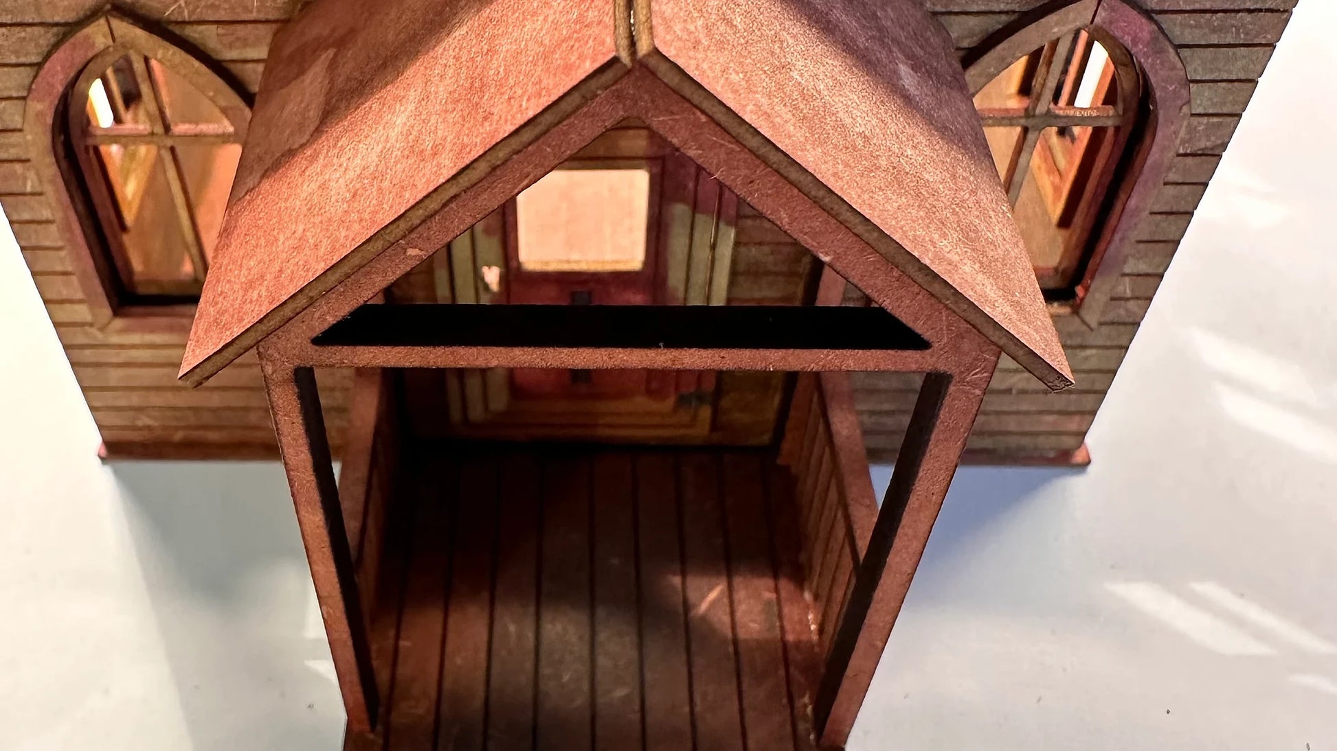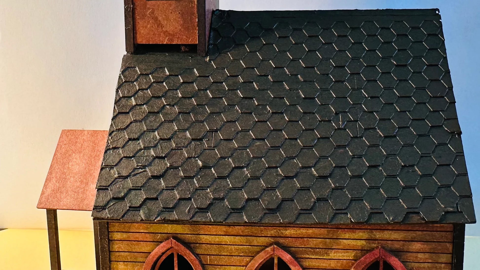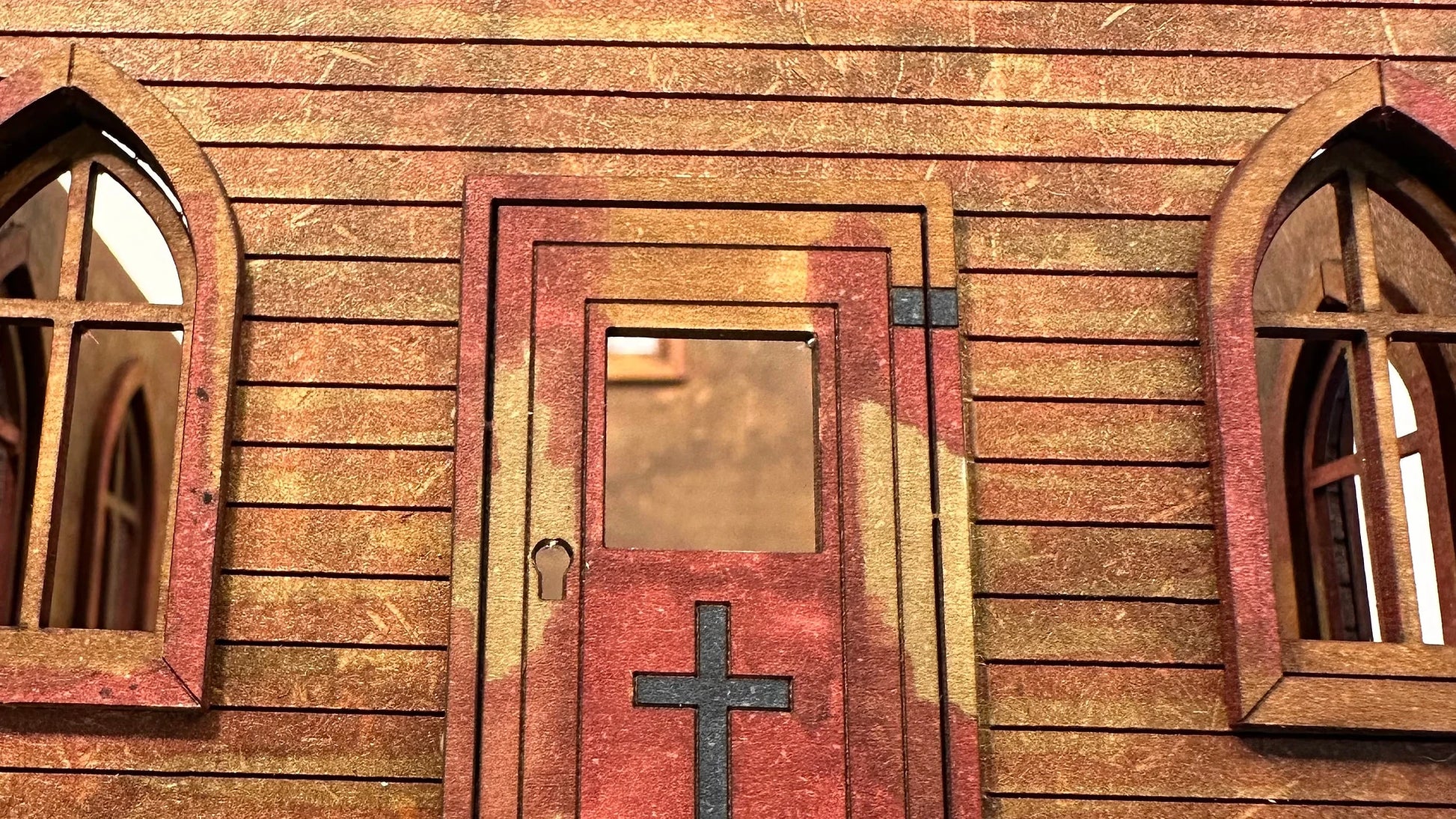 Flat packed, in kit form and ready for construction in colours of your own choosing. Content not included, pews and altar can be purchased separately. Roof tiles can also be purchased separately.