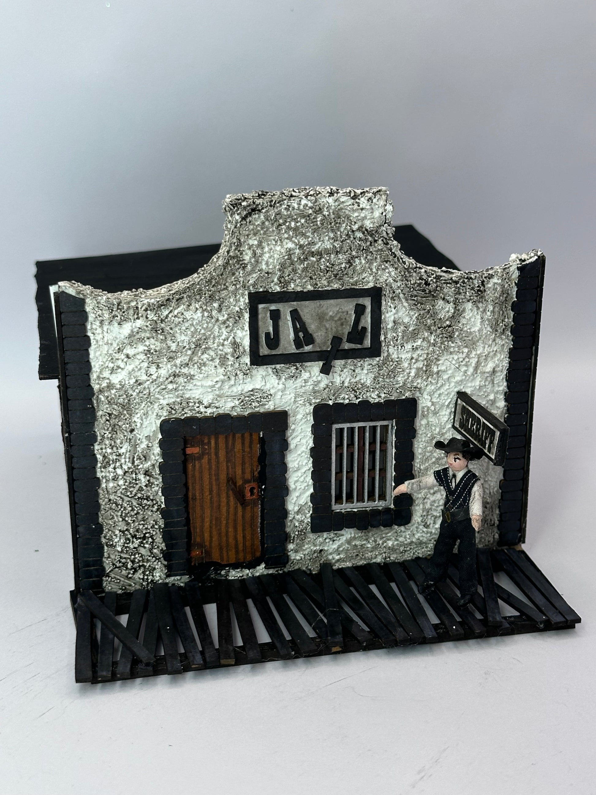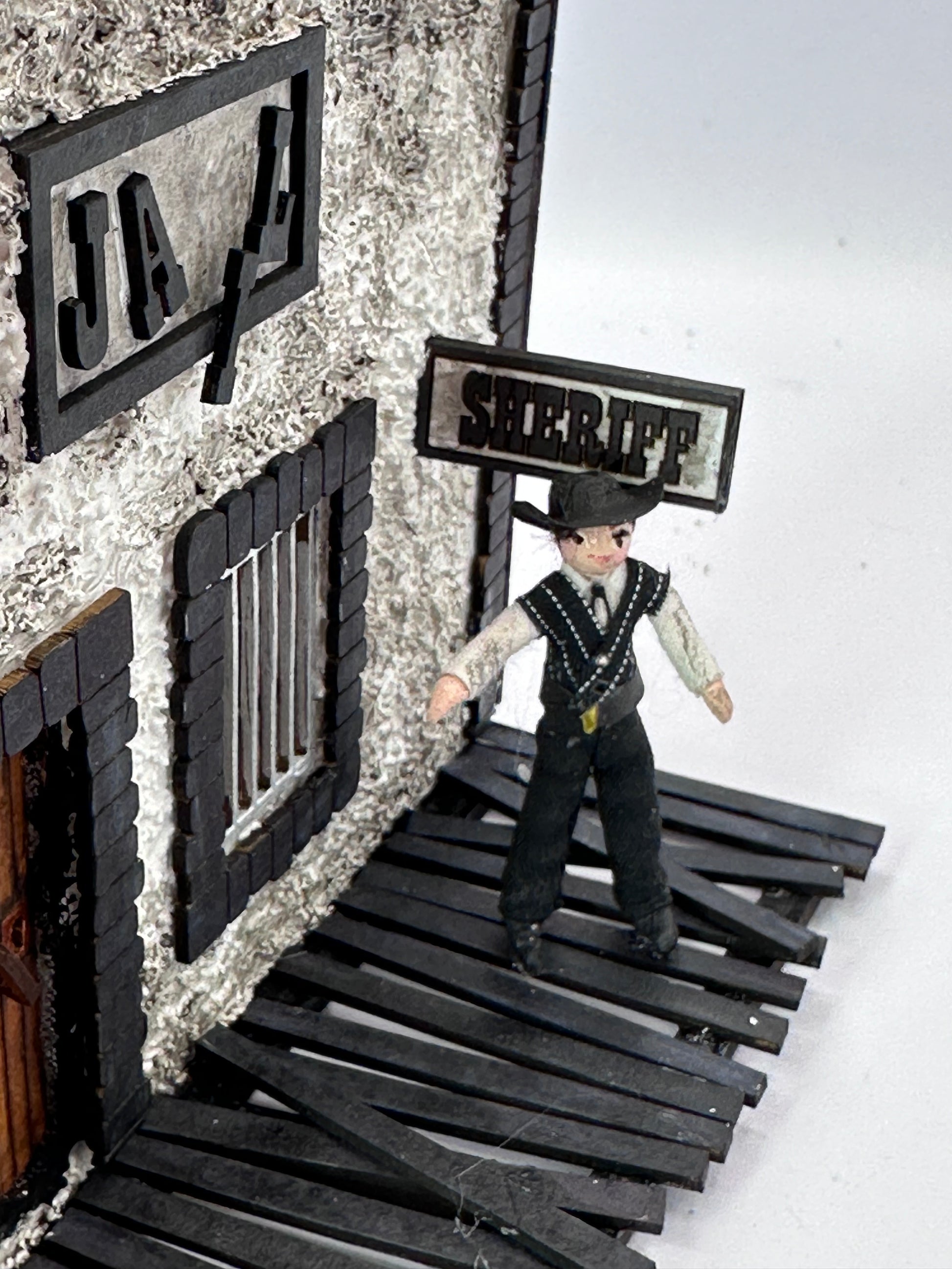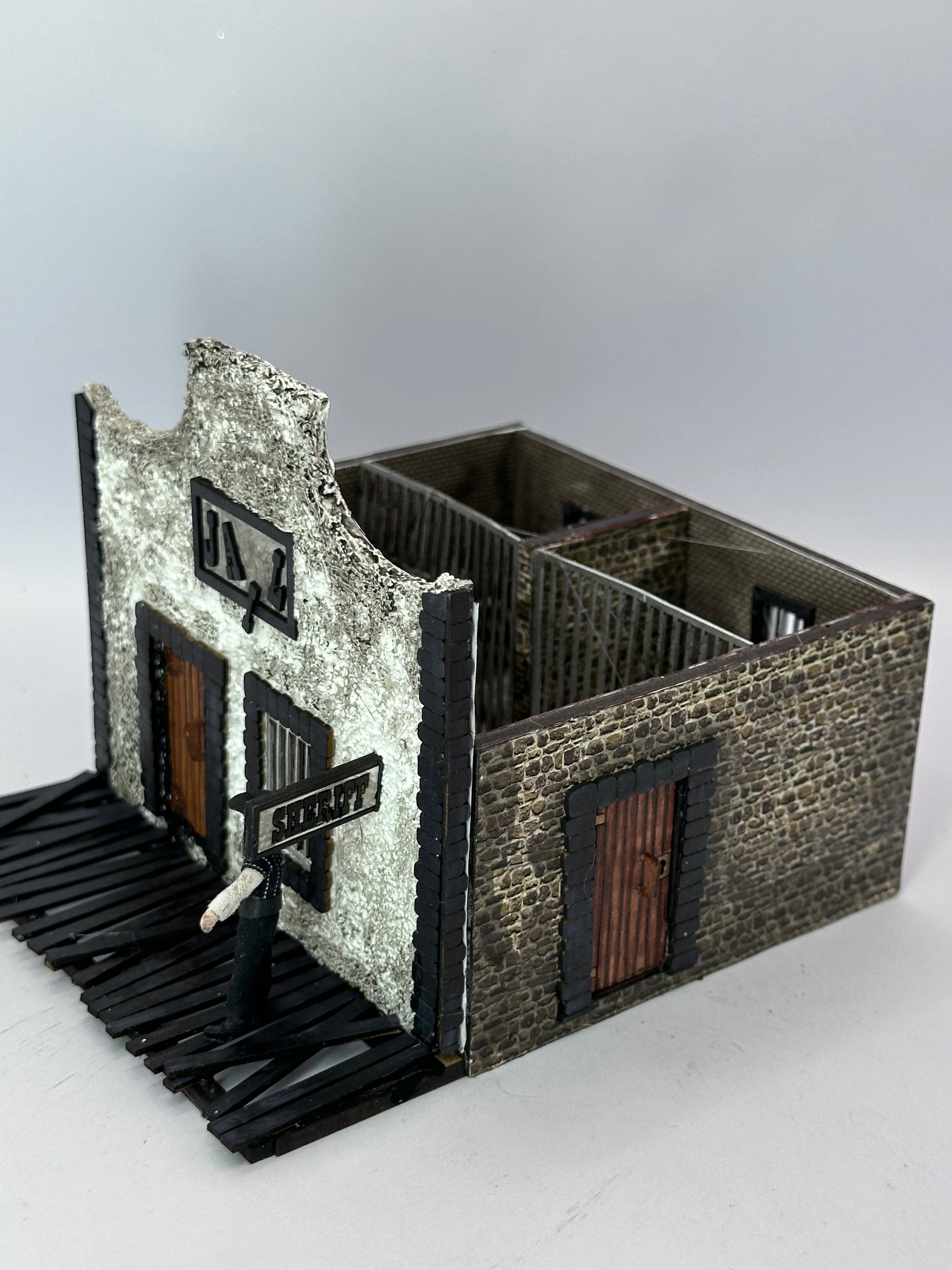 Flat packed, in kit form and ready for construction in colours of your own choosing. Content not included, table/chairs, beds, filing cabinet, can be purchased separately. (Sherrif doll not included)
