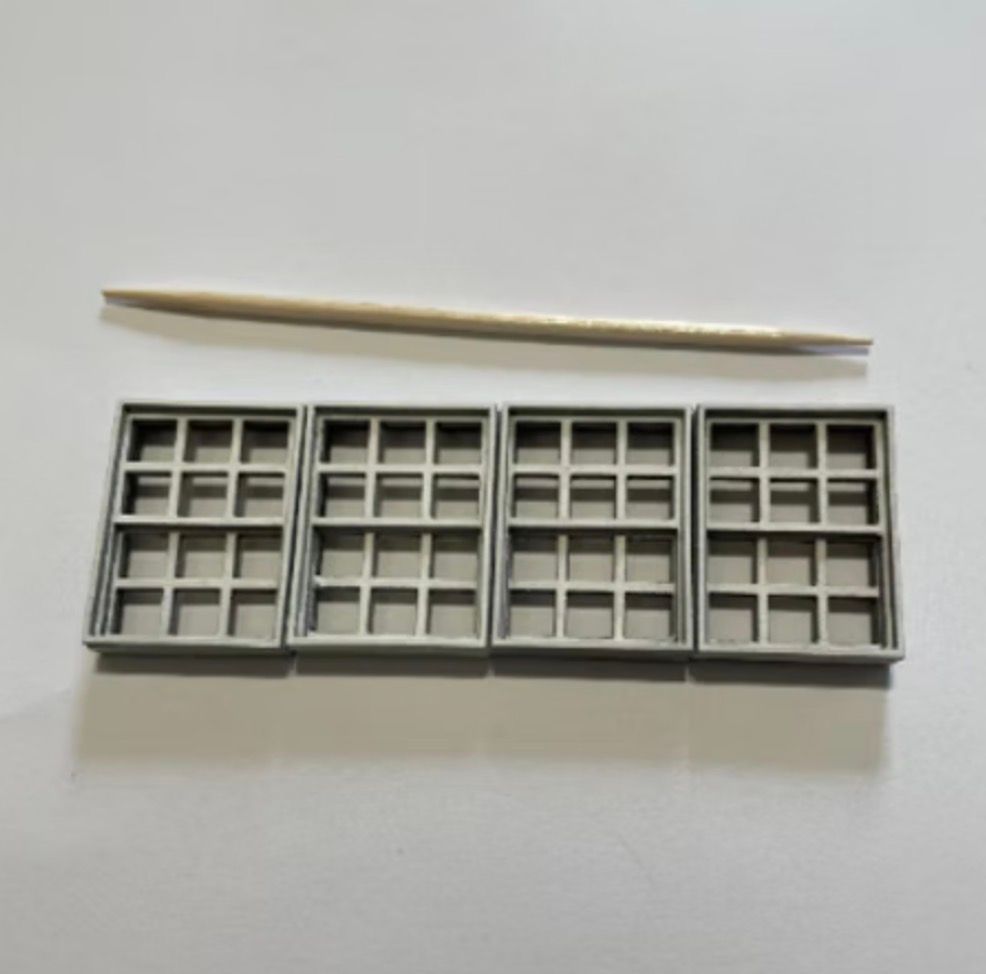 1/48th 4 sash windows, (4 in a pack). Flat packed in kit form and ready for construction in colours of your own choosing. Non-opening. Each window is 1.9 cms wide x 2cms high A sash window or hung sash window is made of one or more movable panels, or “sashes”. The individual sashes are traditionally paned windows, but can now contain an individual sheet of glass. Designed and laser cut by Raptoor. Note: our work conforms fully to the General Product Safety Regulations as laid down by the EU.