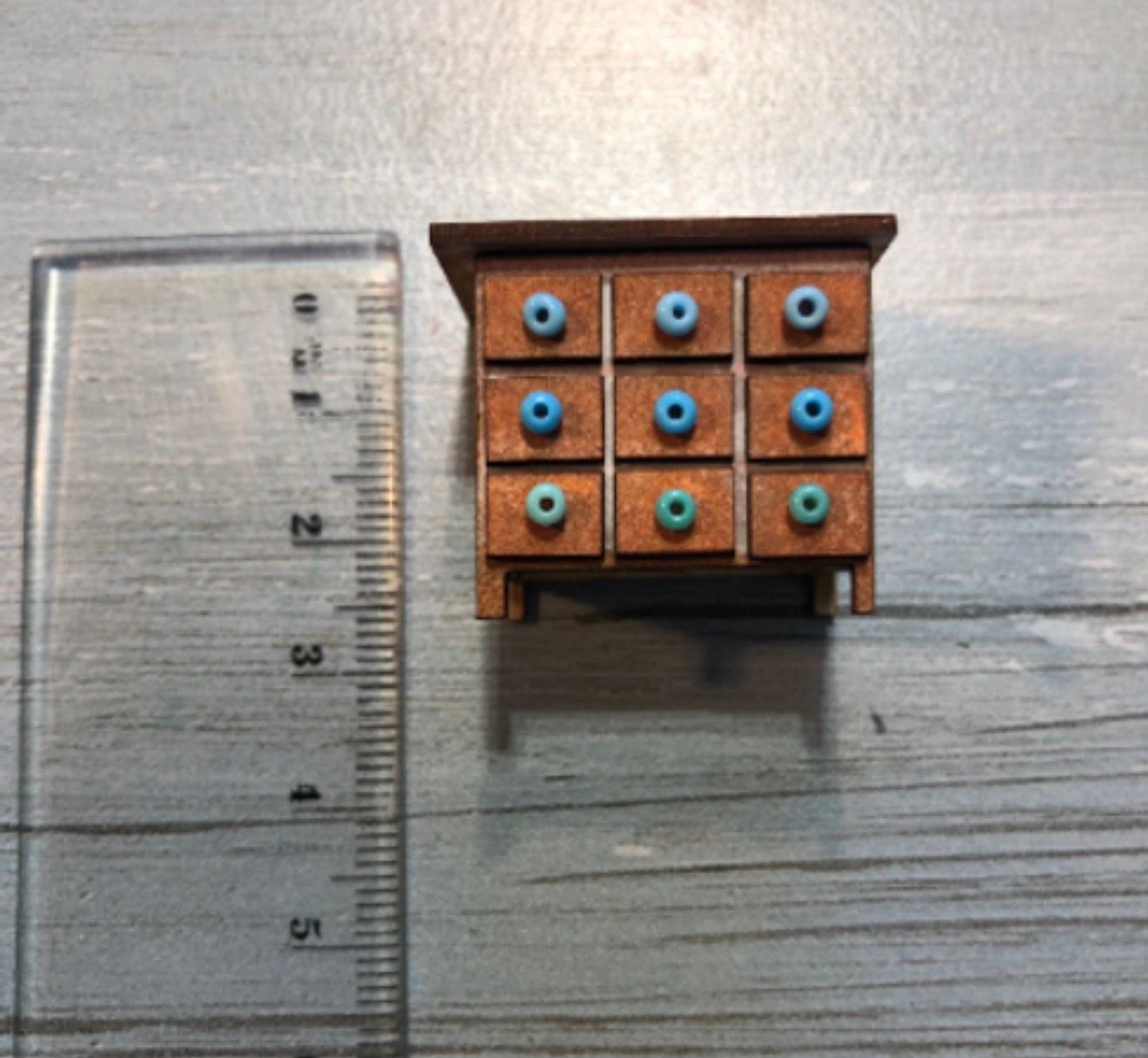 1/48th 9 drawer apothecary cabinet/quarter scale. Flat packed, in kit form and ready for construction in colours of your own choosing. Size: 2.9 wide on the top x 2.4 high x 1.2 wide. Non opening drawers. The decoration is for inspiration only. Beads may vary from cupboard to cupboard. Material/vase/accessories not included. Can be used for Spices and herbs or as a dresser for clothes and other items. Designed and laser cut by Raptoor. Note: our work conforms fully to the General Product Safety Regulations as laid down by the EU.