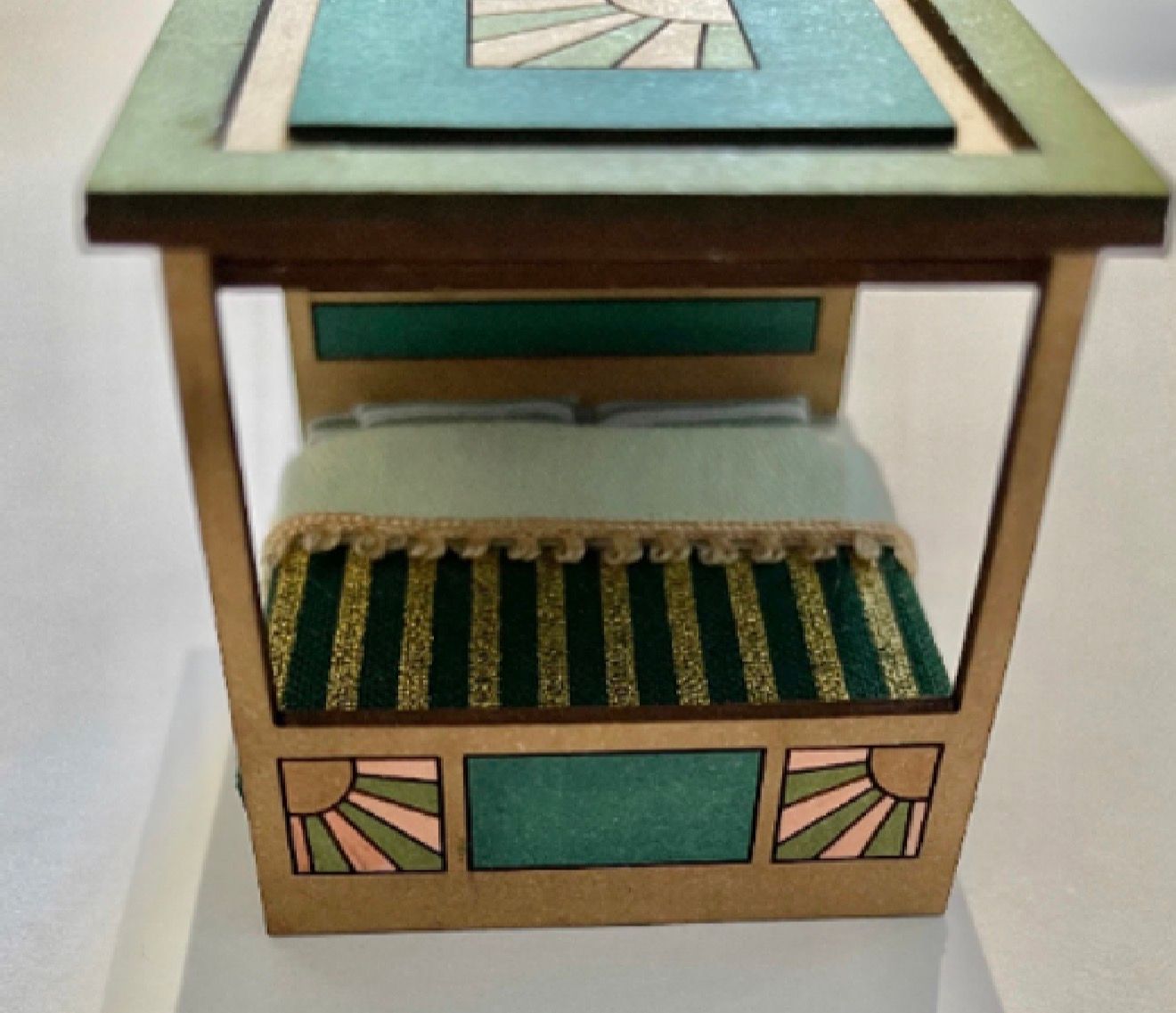 1/48 kit Art Deco 4 poster double bed The Art Deco period is typically in the years of the 1920s and 1930s, and takes its name from the 1925 Paris exhibition. This was the beginning of the first truly modern style after the Edwardian period (1901-1910). Size: 3.2 cms wide x 4 cms long x 3.9 cms high. Flat packed in kit form and ready for construction in colours of your own choosing. Fabric is not included, this is just a suggestion for decoration. Designed and copyrighted by Raptoor.