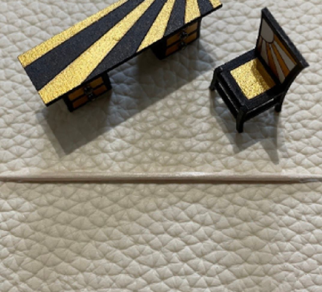 Chair: 2.8 cms high x 1.6 cms wide at the widest point.