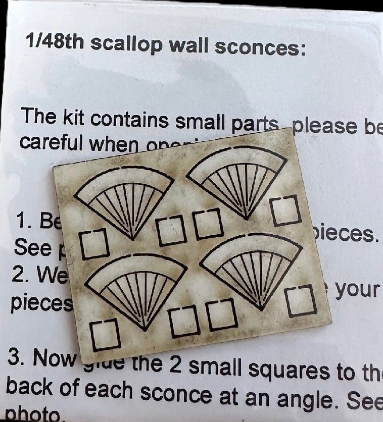 1/48th kit Art Deco scollop sconces (4 pack) Flat packed, in kit form and ready for construction in colours of your own choosing. Size: 1.9cms wide x 1.4 cms high at their widest and highest parts. Designed and copyrighted by Raptoor