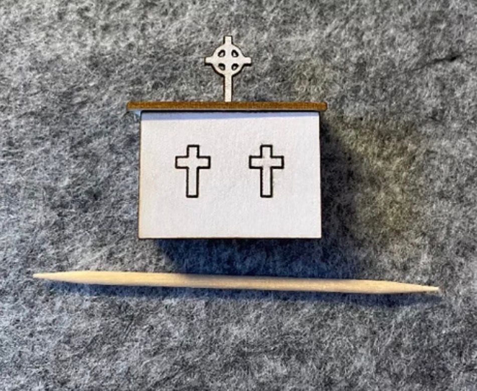 1/48th kit crosses altar. Flat packed in kit form and ready for you to choose your own colours and design. I used sand mixed with pva glue and gray paint to give a stone effect. 3.1cms length on the top end to end, the alter base is 2.8 cms long. Height 2.1cms x Depth 1.1 cms. Designed and laser cut by Raptoor. Note: our work conforms fully to the General Product Safety Regulations as laid down by the EU.