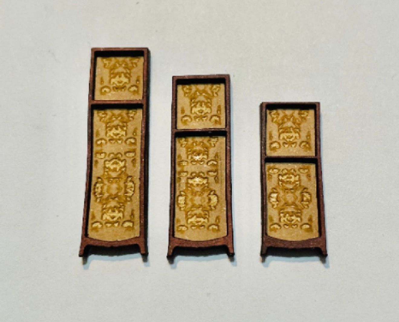 1/48th decorative dressing screen. Flat packed, in kit form and ready for construction in colours of your own choosing. T Ribbon not included, this is just a suggestion for decoration. Size: tell panel 3.5 cms high, smallest 2.5 cms high. Width 3 cms long when laid flat. Designed and laser cut by Raptoor. Note: our work conforms fully to the General Product Safety Regulations as laid down by the EU.