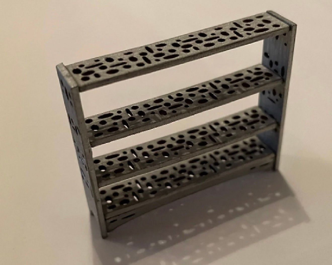 Final Frontier shelving unit. Size: table: 3.5 cms wide x 2.3 cms high. Flat packed in kit form and ready for construction in colours of your own choosing. The accessories are not included and are just an example of how the shelves can be decorated. Matches our final frontier space collection. Designed and laser cut by Raptoor.