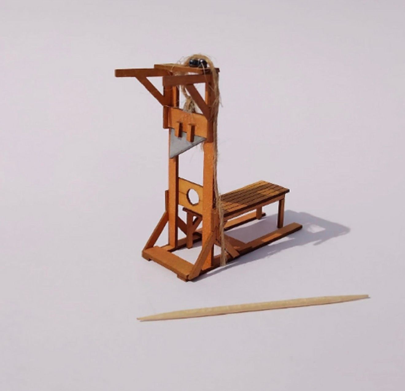 Flat packed, in kit form and ready for construction in colours of your own choosing. This is an advanced kit for an experienced dolls house maker. Size: 5.5 cms length x 2.5 cms depth x 6cms high. You can shorten the legs to make it smaller if you wish. The blade does not move up and down. Introduced in 1792 by by Dr. Joseph Ignace Guillotin, it was a device designed for inflicting capital punishment via, decapitation using a heavy, very sharp angled blade dropped between two posts. it was called a more 'humane and egalitarian' form of execution killing around 15,000 people and remained in use in France till 1977! and was famously used on King Louit XVI of France and Marie Antoinette. Was it an instrument of democratic justice, or a weapon of tyrannical terror? Designed and copyrighted by Raptoor