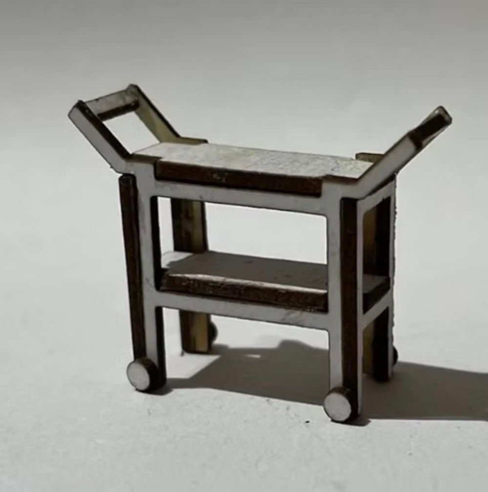1/48th hostess drinks and tea trolley Flat packed, in kit form and ready for construction in colours of your own choosing. Size: 2 cms long x 1.8 cms high x 1 cms deep. Wheels and trays are non moving. I combine postage, so please send me a message to discuss. Designed and laser cut by Raptoor. Note: our work conforms fully to the General Product Safety Regulations as laid down by the EU.