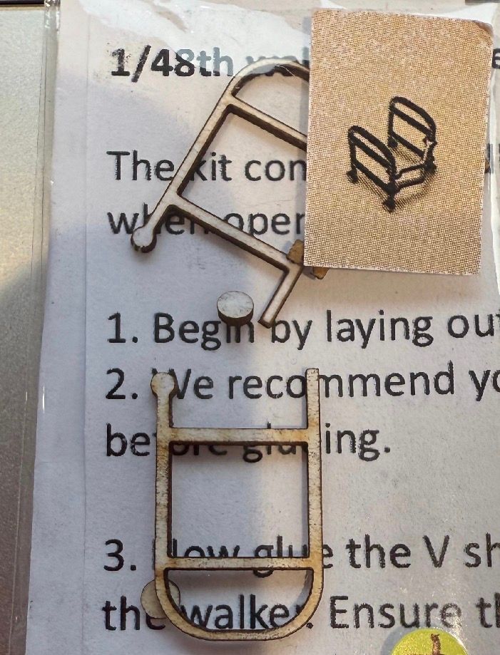 1/48th kit, walking frame, quarter scale Flat packed, in kit form and ready for construction in colours of your own choosing. wheels are non turning. Size: 1.8 cms deep x 1.6 cms long x 2 cms high. Designed and copyrighted by Raptoor Note: our work conforms fully to the General Product Safety Regulations as laid down by the EU.