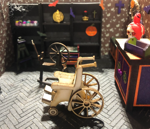 This 1/48th-scale wheelchair kit, quarter-scale, is flat-packed and perfect for experienced dollhouse makers. Customise with your own colours!