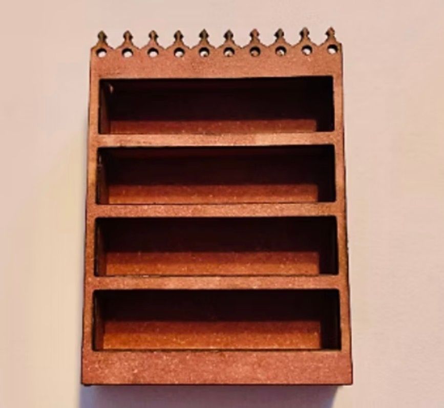1/48th kit Merlin’s bookcase. Flat packed, in kit form and ready for construction in colours of your own choosing. This is an advanced kit for an experienced dolls house maker. Size: 3.2 cms wide x 4.4 cms high at the highest point x 1 cms deep. A bookcase, or bookshelf, is a piece of furniture with horizontal shelves, often in a cabinet, used to store books or other printed materials. Bookcases are used in private homes, public and university libraries, offices and bookstores. I combine postage, so please send me a message to discuss. Designed and laser cut by Raptoor. Note: our work conforms fully to the General Product Safety Regulations as laid down by the EU.
