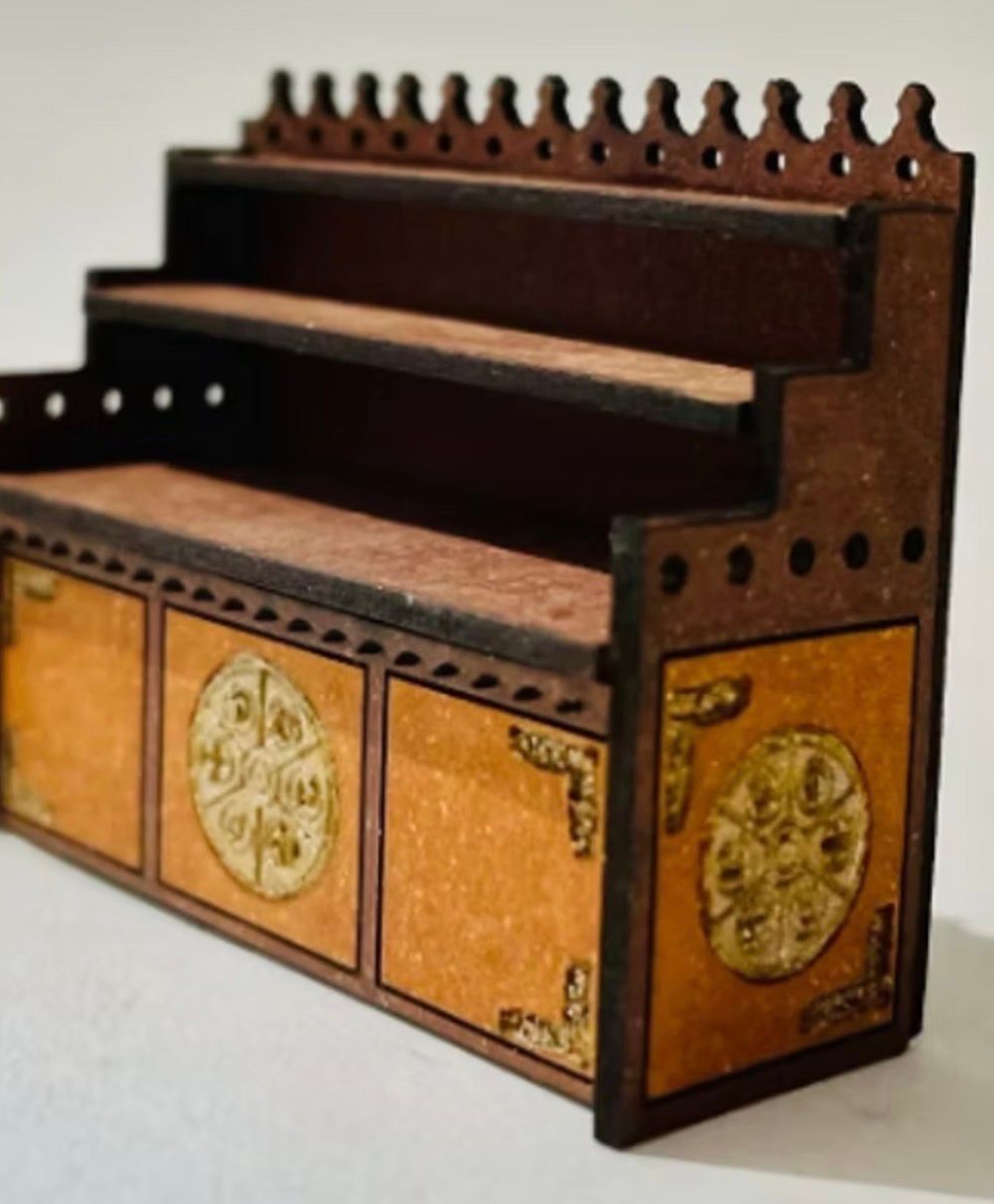 1/48th kit Merlin’s dresser. Flat packed, in kit form and ready for construction in colours of your own choosing. The bottles, candles etc are just a suggestion for decoration and not included in the kit. Size: 4.4 cms long x 1.6 cms deep x 3.6 cms high A dresser or a china hutch, sometimes known as a kitchen dresser or pewter cupboard, is a piece of wooden furniture consisting of drawers and cupboards in the lower part, with shelves and perhaps a sideboard on top. Designed and laser cut by Raptoor. Note: our work conforms fully to the General Product Safety Regulations as laid down by the EU.