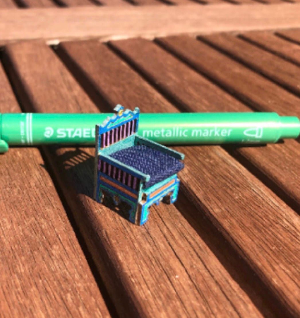 1/48th Moroccan style chair. Flat packed, in kit form and ready for construction in colours of your own choosing. I used copic and promarker staining pens rather than paint. Size: height 2.6cms from the chair tip, width 1.7 cms, depth 1.7 cms. Material/cushion not included. The pen is for scale. Moroccan furniture is informal and colorful. It combines natural materials like wood with colorful fabrics and patterned surfaces. Couches and sofas are low to the ground, upholstered or covered with materials like wool, silk and velvet. Bold and bright, Moroccan decor features a blend of ornate patterns, vibrant colors, and metallic accents for a worldly vibe. Elaborately carved wood furniture sets the backdrop for vivid reds, oranges, blues, and greens. Pouf ottomans with intricate stitching lend a relaxed-but-chic feel to any room. The Moroccan design style is all about color, texture, and fluid lines. This design style draws much of its inspiration from the Moorish design of the East and from the shapes and colors of the rolling sands of the desert. Its intricate beauty is seductive and inspires colorful and stylish interiors. Designed and laser cut by Raptoor