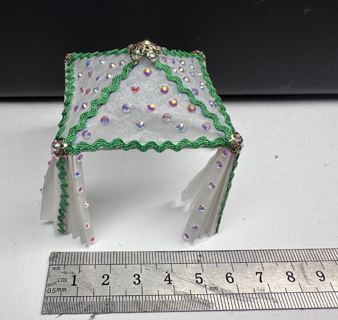 Made from fine spokes of the best quality mountboard and covered with sections of tissue paper, it's not for the faint-hearted, as it's rather fiddly but well worth the effort. Decorate as you wish, the braid & crystals are my own & not included in the kit.