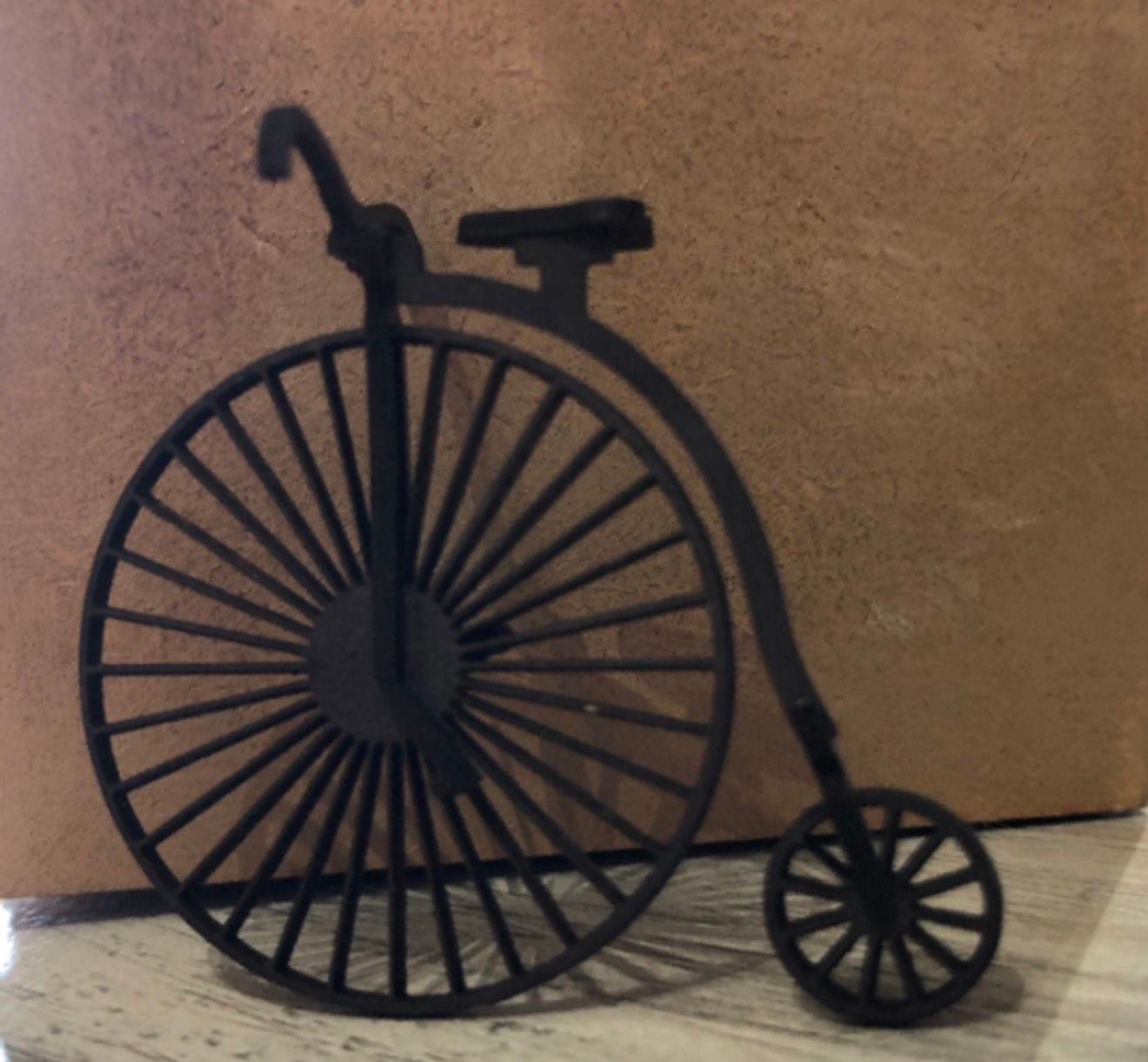 1/48th penny farthing/quarter scale. Size: 4.7 wide at the widest point x 4.7 high at the highest point. Flat packed in kit form and ready for construction in colours of your own choosing. This is an advanced kit for an experienced dolls house maker. The penny-farthing, also known as a high wheel, high wheeler or ordinary, was the first machine to be called a “bicycle”. It was popular in the 1870s and 1880s, with its large front wheel providing high speeds (owing to it travelling a large distance for every rotation of the legs) and comfort (the large wheel provides greater shock absorption). Although the trend was short-lived, the penny-farthing became a symbol of the late Victorian era. Its popularity also coincided with the birth of cycling as a sport. The penny farthing needed to be propped against something to stand alone as the person riding provided the balance. I combine postage, so please send me a message to discuss. Designed and laser cut by Raptoor. Note: our work conforms fully to the General Product Safety Regulations as laid down by the EU.