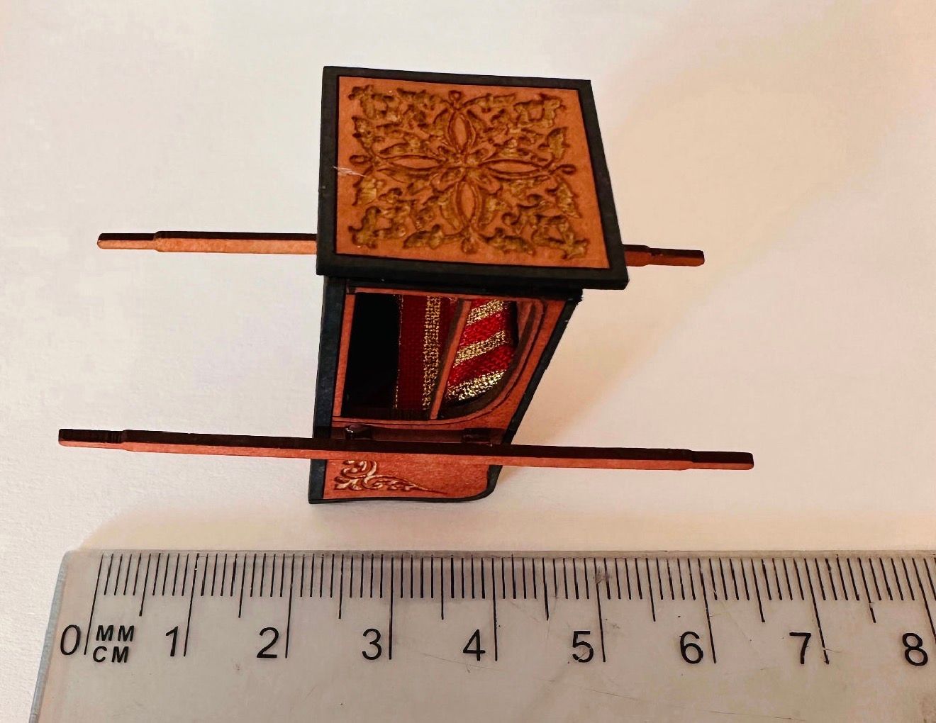 1/48th kit, sedan chair. This is an advanced kit for an experienced dollshouse kit maker. Flat packed, in kit form and ready for construction in colours of your own choosing. Fabric not included and is a suggestion for decoration. Size: 5.3 cms long at the longest point x 1.9 cms wide x 3.5 cms high. A sedan chair is an enclosed chair for one person carried on two poles by two men, one in front and one behind. Sedan chairs were used in the 17th and 18th centuries. Desgined and laser cut by Raptoor.
