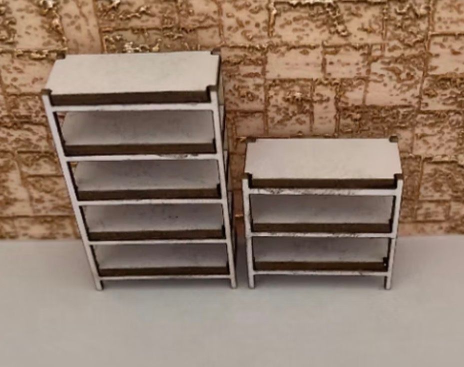 1/48th kits, 2 shelving units Flat packed, in kit form and ready for construction in colours of your own choosing. Size: small: 2.1 cms wide x 2 cms high. Large: 2.1 cms wide x 3.2 cms high. I combine postage, so please send me a message to discuss. Designed and laser cut by Raptoor. Note: our work conforms fully to the General Product Safety Regulations as laid down by the EU