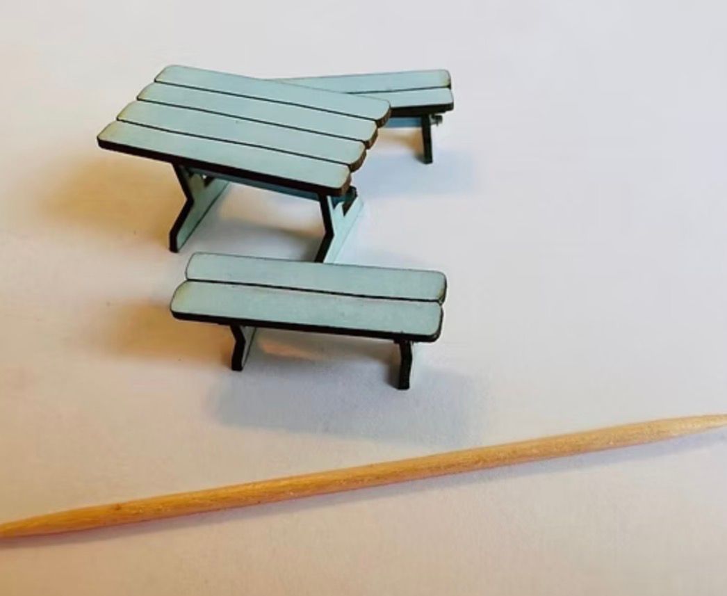 1/48th table and 2 benches Flat packed, in kit form and ready for construction in colours of your own choosing. Size table: 3 cms long x 1.2 cms wide x 1.4 cms high.Benches: 2.3 cms long x 1.3 cms wide Designed and copyrighted by Raptoor Note: our work conforms fully to the General Product Safety Regulations as laid down by the EU.