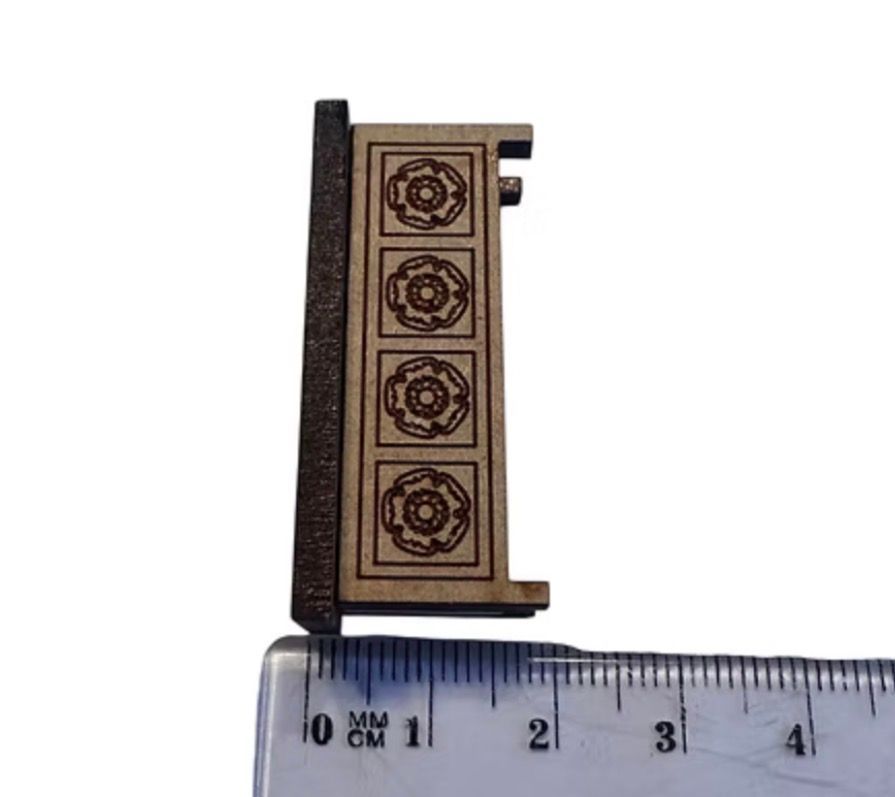 Tudor blanket chest 1/48th engraved with the Tudor rose. Flat packed, in kit form and ready for construction in colours of your own choosing. Size: 4.2 cms long x 1.8 cms high x 1.5 cms deep from the lid/top. Non opening lid. Coffers were used for traveling, or for storing valuables, chests were more generic. This example would, in its day, have been called a chest. More recently, however, the name "coffer" has been used by collectors and dealers for these early chests to distinguish them from 18th and 19th century ones. The Tudor Rose is the symbol of the Tudor family and is represented by the union of a red and white rose. The red rose being the House of Lancaster and the white the House of York. This union brought to an end the bitter civil war which is commonly referred to as ‘The War of the Roses’. Designed and copyrighted by Raptoor Note: our work conforms fully to the General Product Safety Regulations as laid down by the EU.