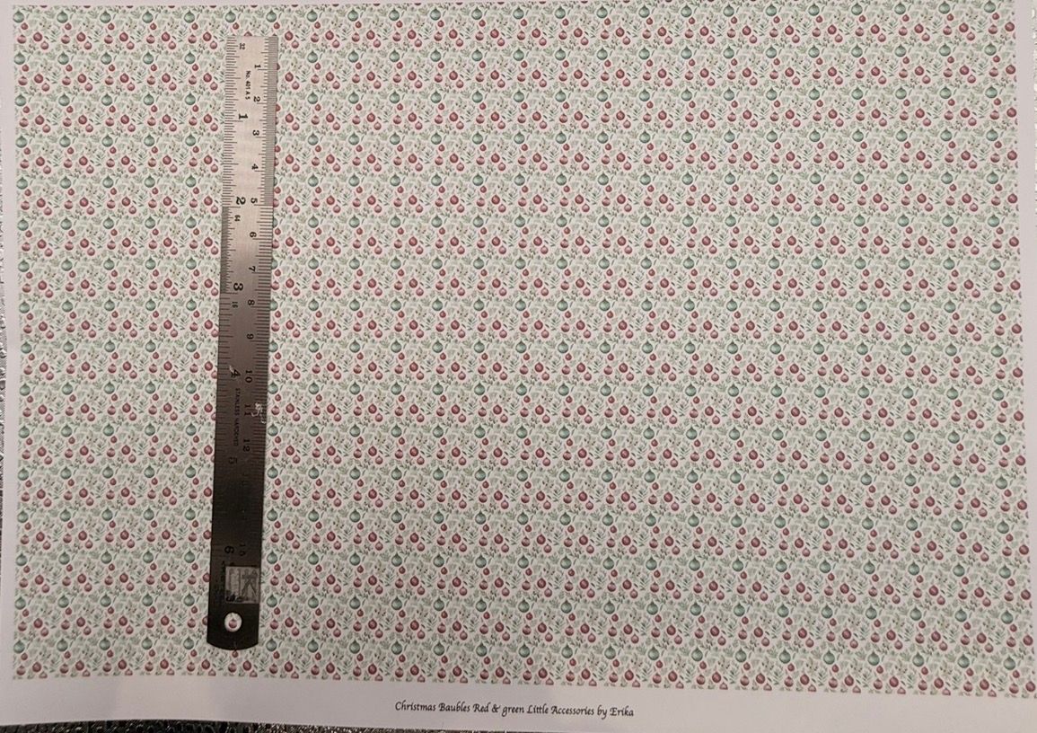 Wallpaper/fabric. Christmas baubles red & green. 1/48 scale
