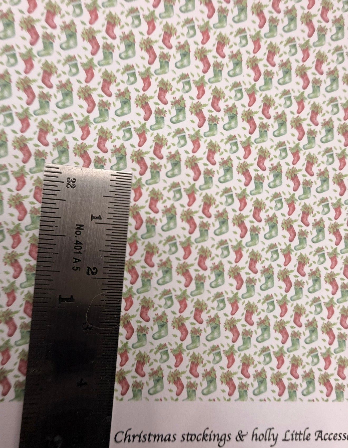 Wallpaper/fabric. Christmas stockings & holly. 1/48 scale