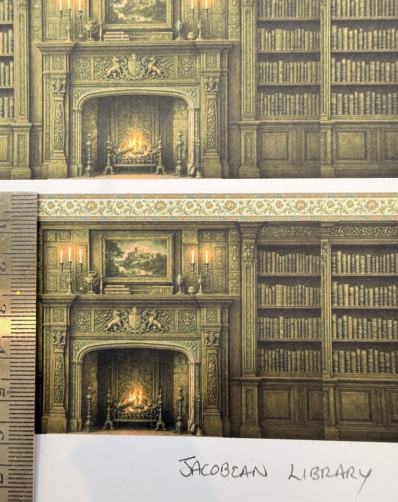 Wallpaper/fabric. Jacobean wood library. 1/48 scale