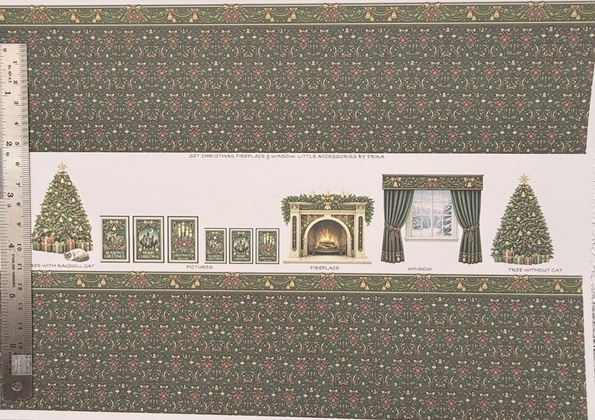 Wallpaper/fabric. SET christmas fireplace & window. 1/48 scale